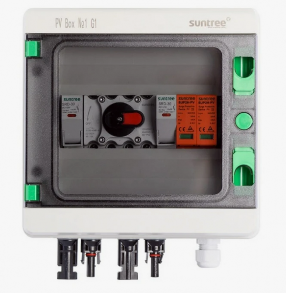 Распределительный щит постоянного тока с набором предохранителей, устройством защиты от импульсных перенапряжений (УЗИП) и размыкателем цепи в пластиковом корпусе со степенью защиты IP65. Подключение фотоэлектрических модулей производится через разъёмы MC4.